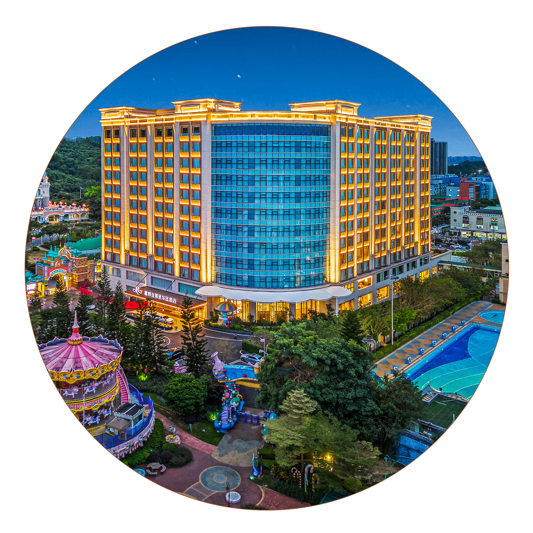 嘉辉会丽呈华廷酒店总建筑面积约为30588m²,定位超高端商务&现代休闲度假的酒店品牌,致力于打造成为粤港澳核心首屈一指的超高端全服务型酒店。酒店建筑外观尊贵时尚,内有高端豪华客房286间、国际宴会厅、会议室、中西、日料餐厅以及可容纳1500人的特大宴会厅,室内外标准泳池、健身房、主题公园等配套设施一应俱全,是一家集商旅拓展、蜜月度假、会议会展、家庭亲子旅游为一体的大型旅游度假综合体酒店。